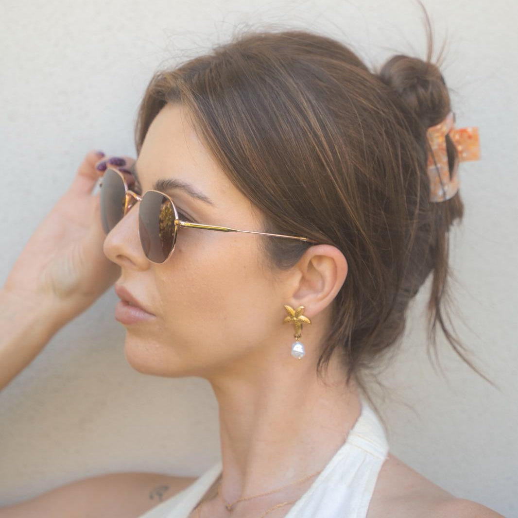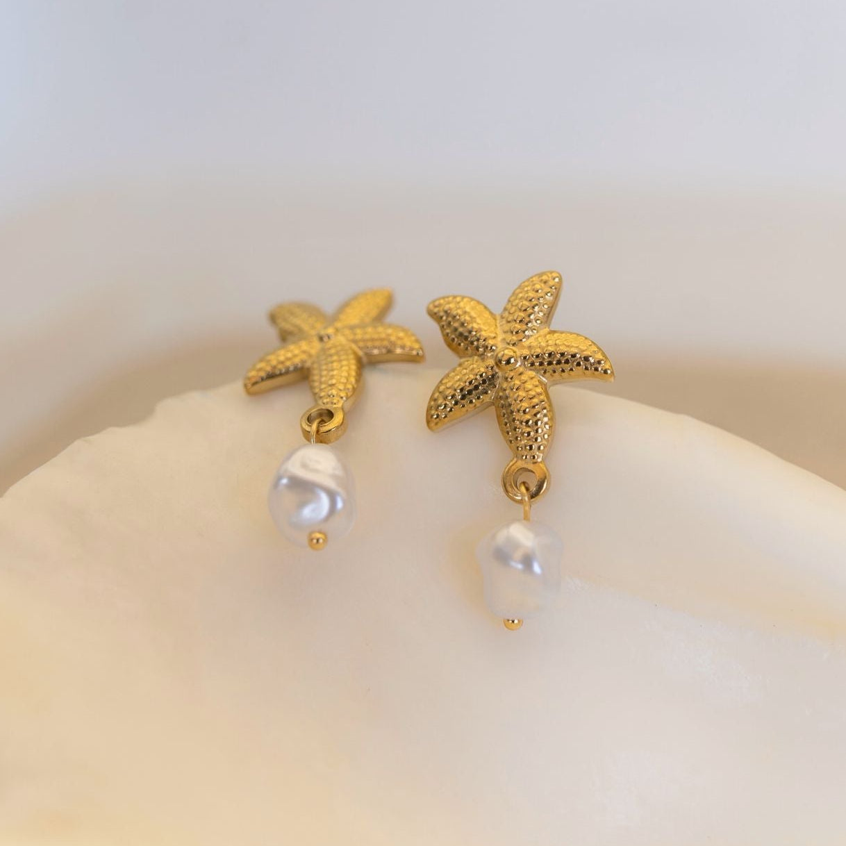 Inspired by sunlit shores, the Estelle earrings blend delicate coastal charm with radiant gold detail. A textured starfish design holds a softly lustrous pearl drop, capturing the essence of oceanic beauty and refined simplicity.